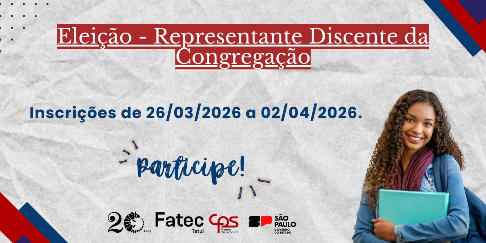 As inscrições para Representante Discente da Congregação estarão abertas do dia 26/03/2026 até o dia 02/04/2026.